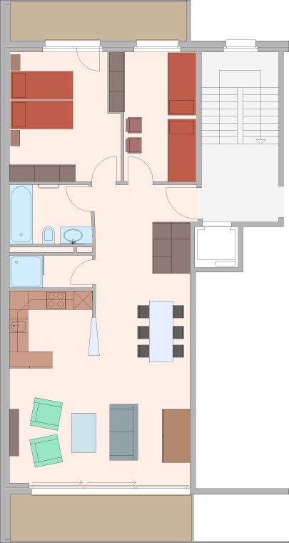 Die Wohnung verfügt über zwei Schlafzimmer und einen grossen Wohn-Essbereich mit direktem Zugang zum sonnigen Südbalkon.